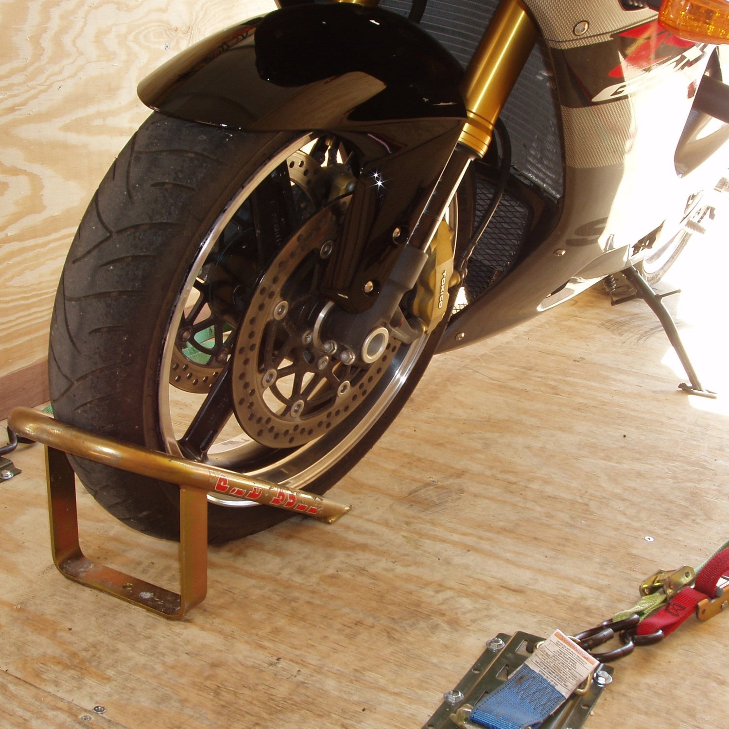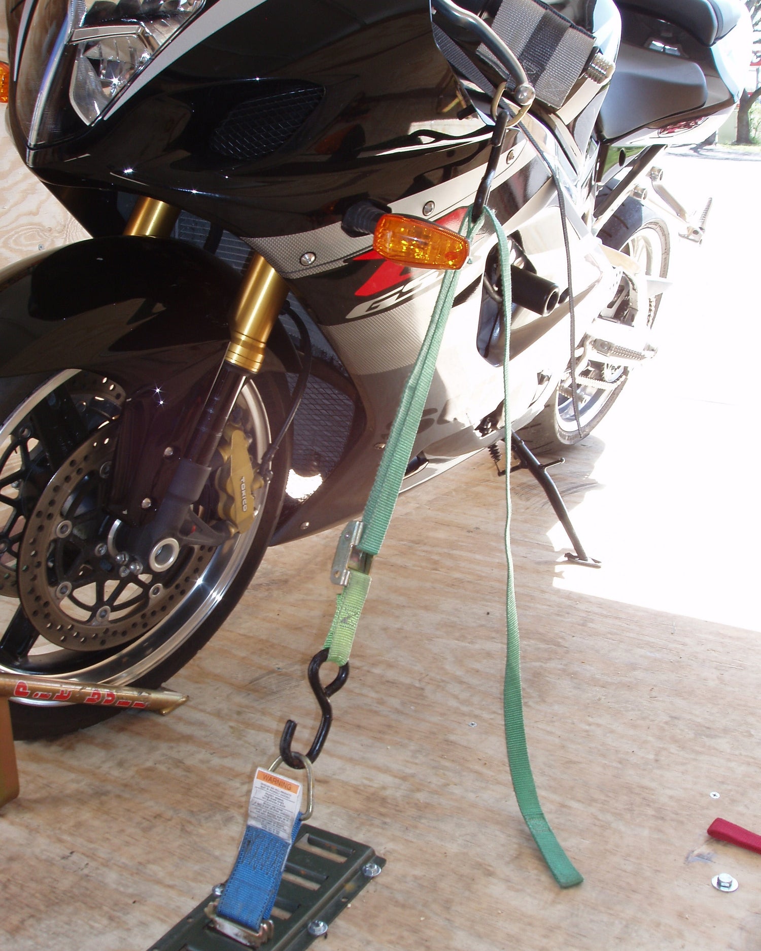 - Pull tie down taut until the motorcycle stand upright*
